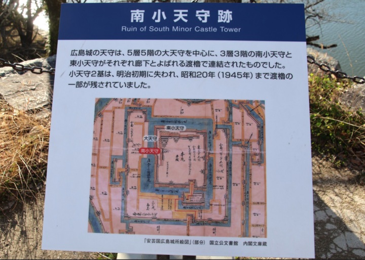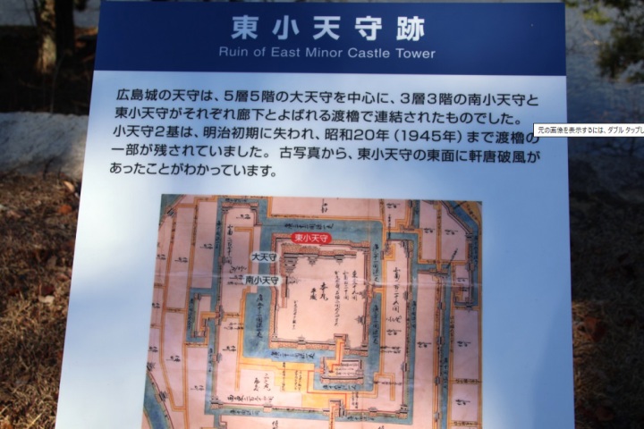 広島城の天守はすごかった【東小天守】南及び東に3階建ての小天守があり、それぞれを渡櫓で結んだ連結式の天守であった。この本来の姿が広島城をもっとも特徴づけるものだった。天守台の下からの高さは12.4m、大天守の高さは26.6mがあり、高さ約30mの大坂城よりは少し小さかったが、天守群の規模では大坂城に見劣りしないものであった。