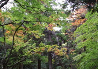 各宗祖師の庭深い木々から漏れる光に照らされて背後に駒ヶ滝があります