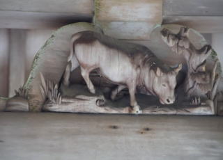 梁上蛙股の牛の彫り物。天神様(菅原道真公)と牛にまつわる伝承縁起がある