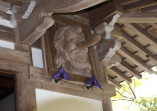 蟇股はその中に梵字で四天王の文字を彫っている。軒支輪の天女があでやかに彫られている。軒鼻に動物の彫刻