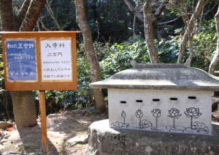 三滝寺参道入口「和の五音」を聴いて、案内板を見て、散策開始です。入寺料の硬貨を入れると入金口により異なる鈴の音が響きます