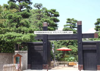 縮景園冠木門 入園口の冠木門は柱と梁を組み合わせが上田宗箇の豪放を感じます。門柱に冠木と呼ばれる横木(梁)を通した簡素な門