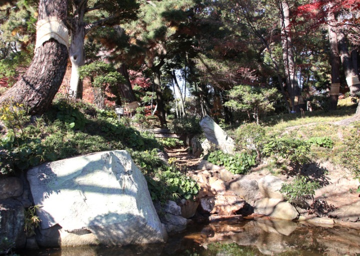 池泉回遊式庭園...【桜花巷(おうかこう)】縮景園仮名記「まず清風の右に桜花巷がある。若木の桜を数をつくして植え、あれやこれや立ち並んでいる。花のさかりの頃にはまるで白雲をつらぬいて通うようで、まさに花の道であることだ」