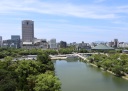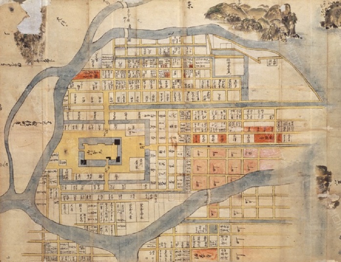 平地と水堀に囲まれ平城に建てられた天守【毛利氏の広島城下と天守】水流豊かな地形を利用した城郭。外堀には太田川の支流である西の本川、東に京橋川。天守から城下町一帯を一望。城下町からは天守の姿を何処からでも羨望。天守/城郭が城下と一帯化、暮らしが共存した治世。