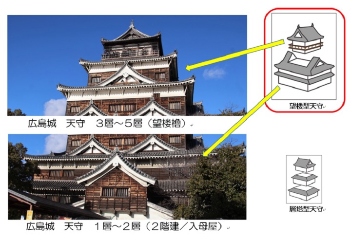 広島城の天守はすごかった【東小天守】南及び東に3階建ての小天守があり、それぞれを渡櫓で結んだ連結式の天守であった。この本来の姿が広島城をもっとも特徴づけるものだった。天守台の下からの高さは12.4m、大天守の高さは26.6mがあり、高さ約30mの大坂城よりは少し小さかったが、天守群の規模では大坂城に見劣りしないものであった。